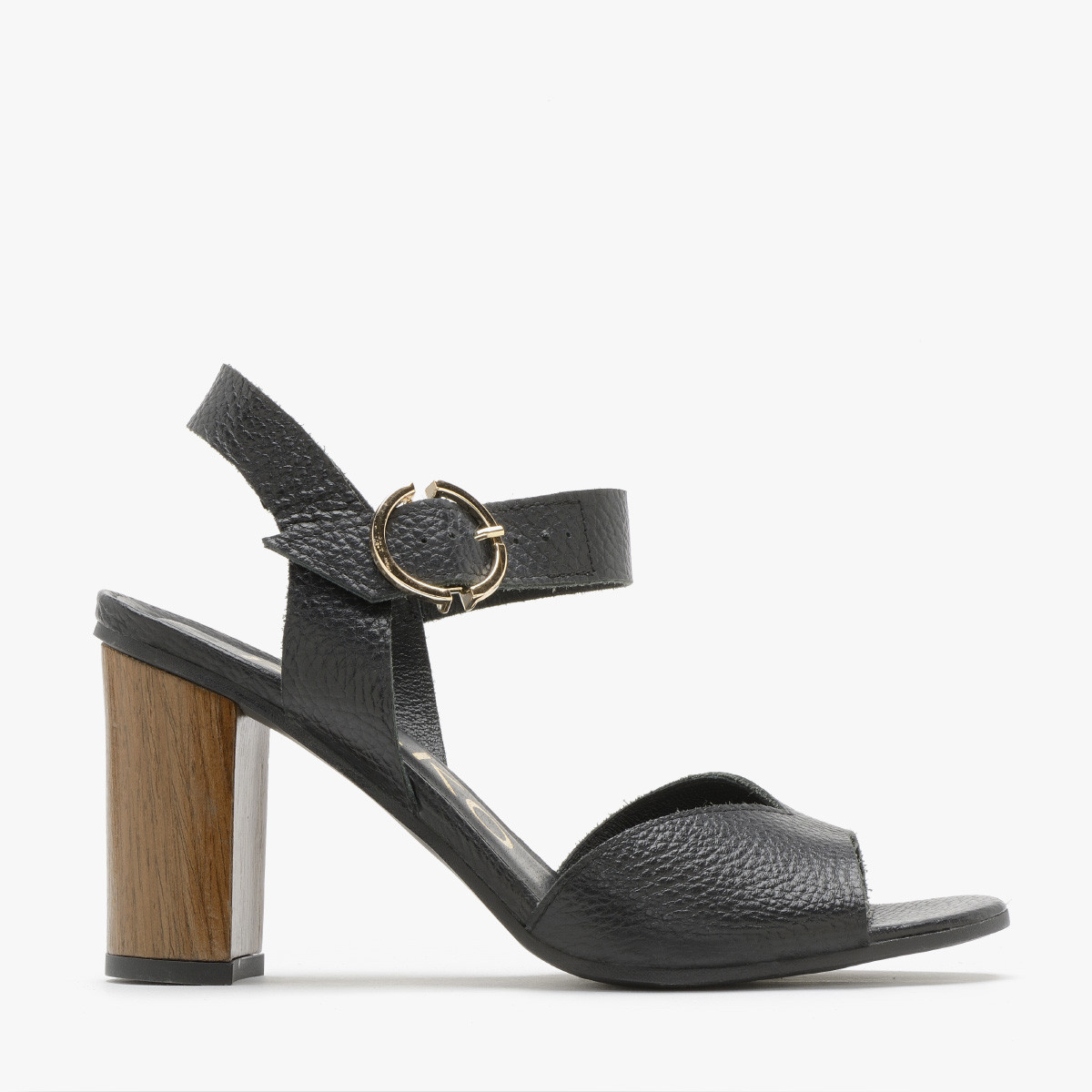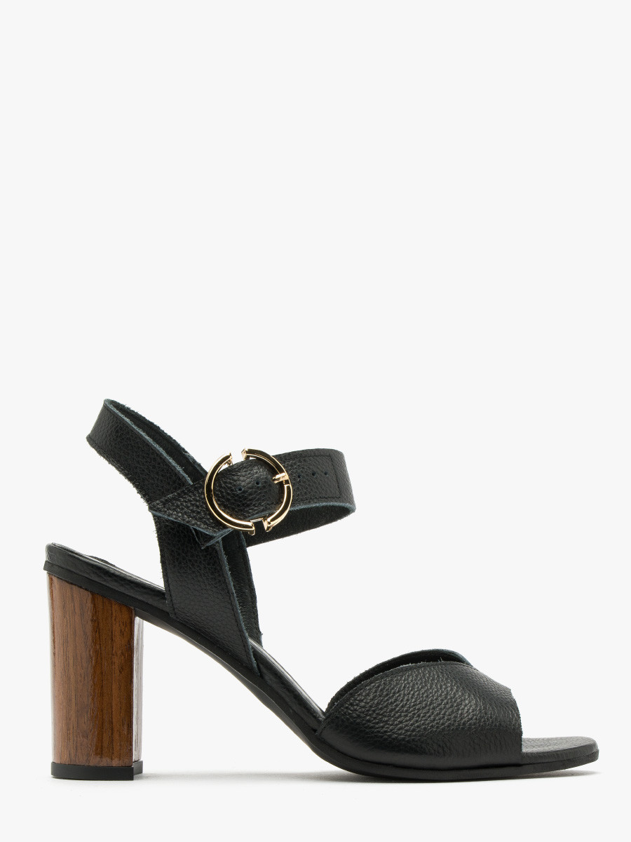 Czarne sanday na drewnianym supku