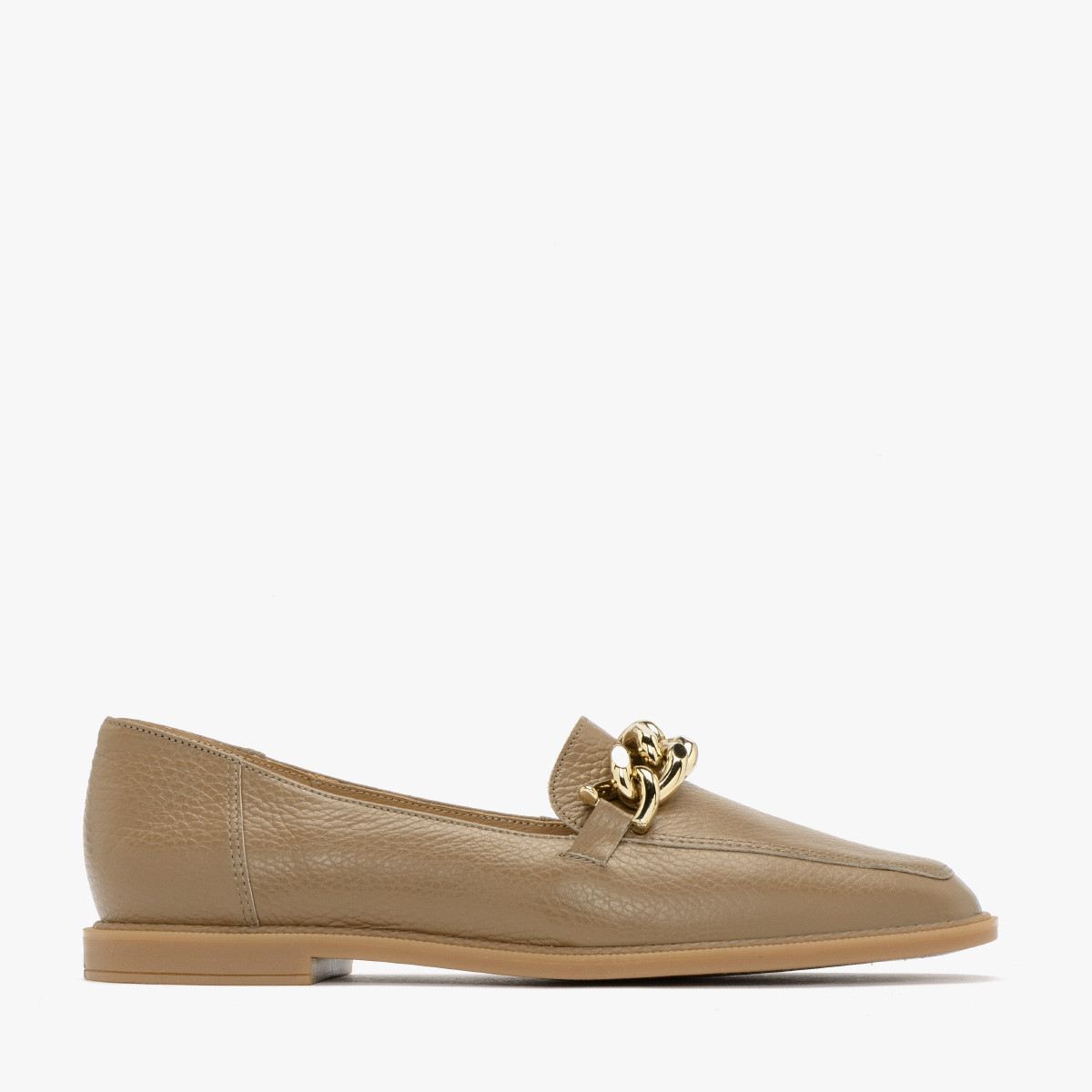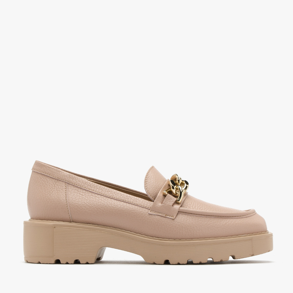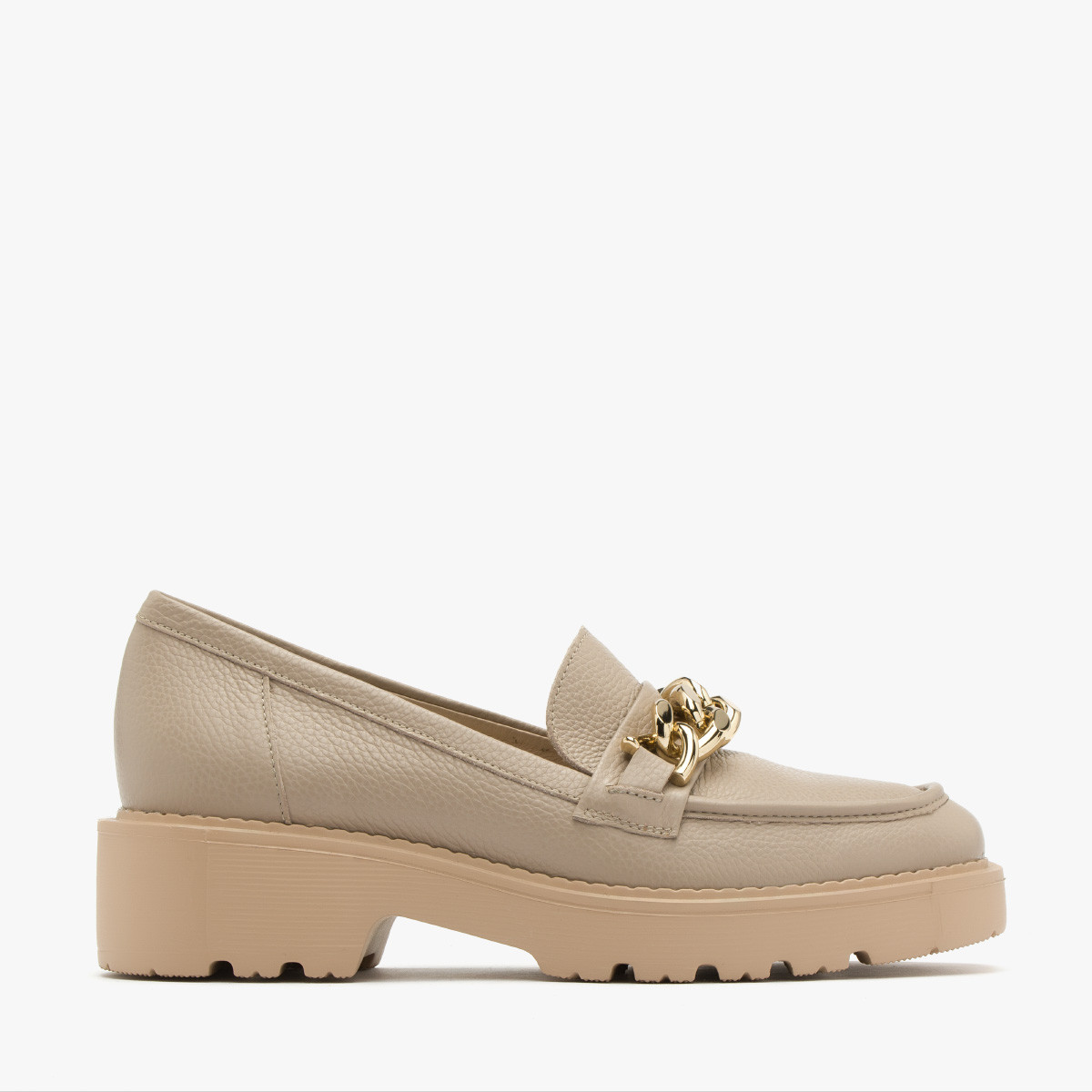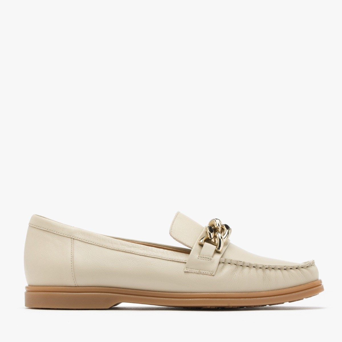 Kremowe mokasyny ze zotym ańcuchem na cholewce